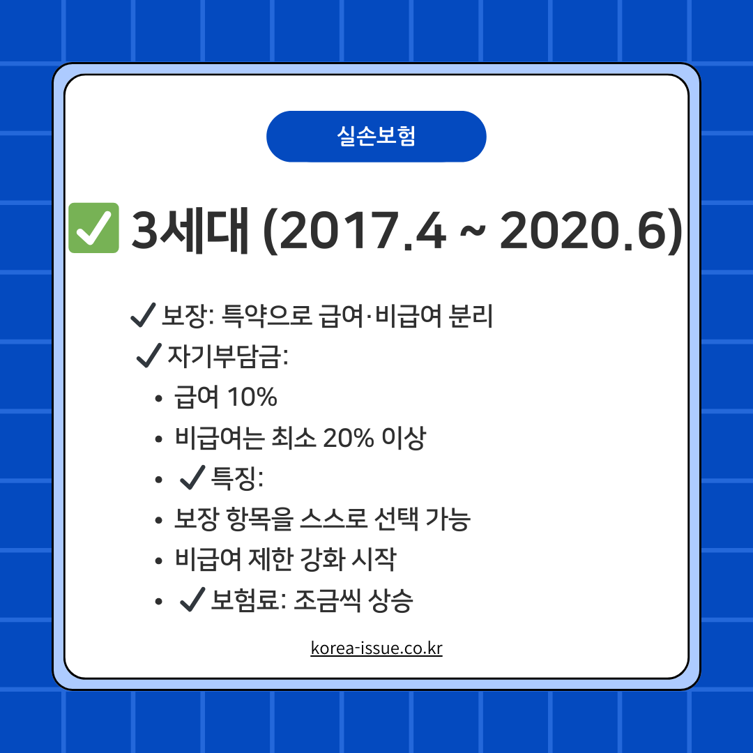 | 3세대 | 2017.4~2020.6 | 특약 분리 (급여/비급여) | 급여 10%, 비급여 20~30% | 다소 상승 | 일부 제한 |