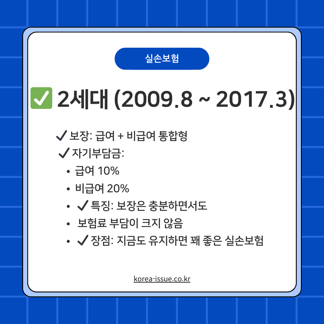 | 2세대 | 2009.8~2017.3 | 실손 통합형 최초 도입 | 급여 10%, 비급여 20% | 낮음 | 광범위 보장 |