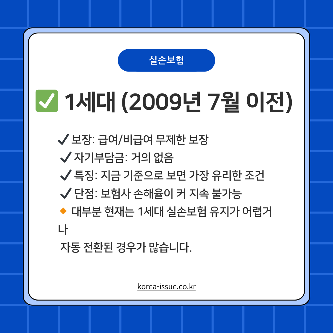 | 1세대 | 2009년 7월 이전 | 급여+비급여 무제한 | 없음 또는 낮음 | 매우 낮음 (정액형) | 제한 없음 |