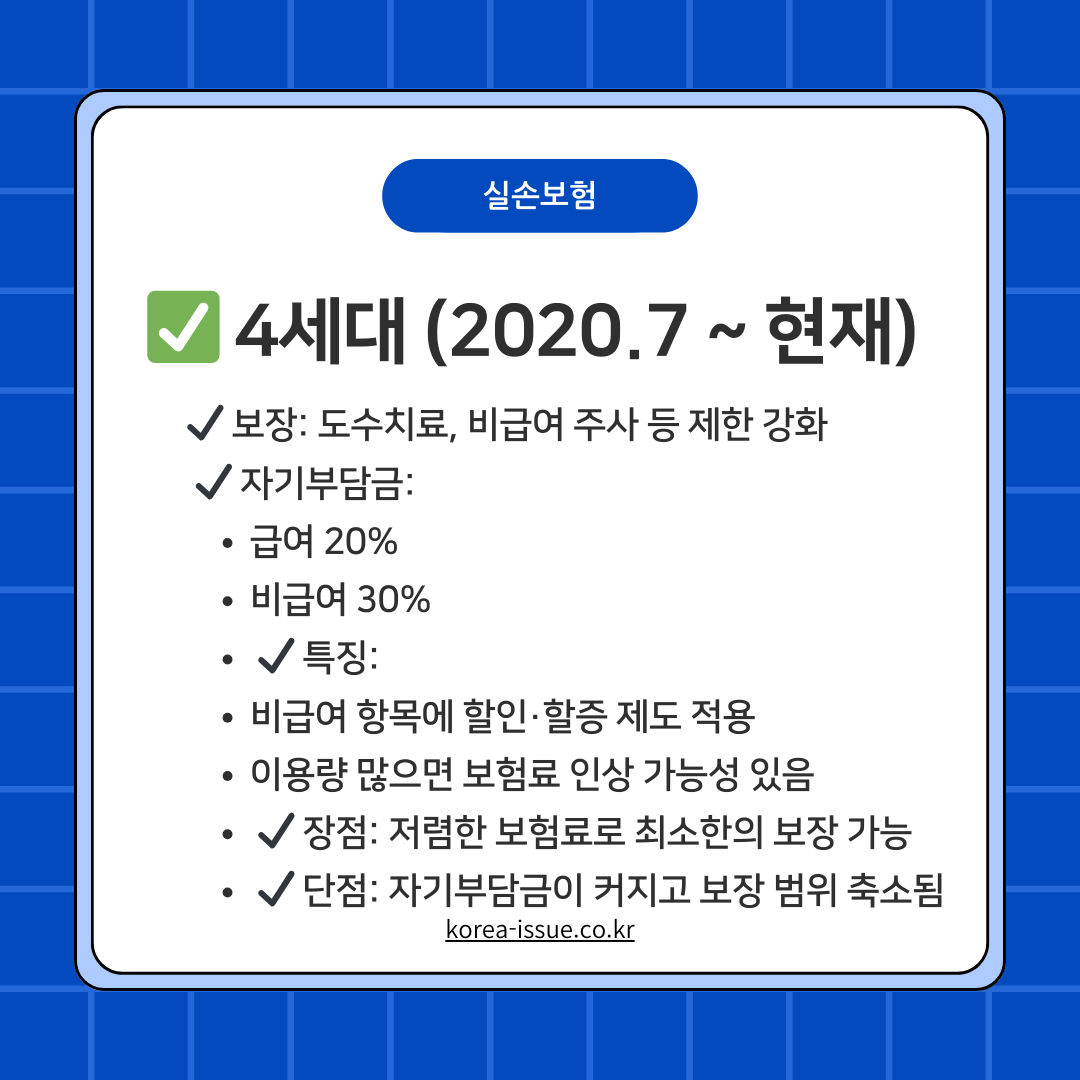| 3세대 | 2017.4~2020.6 | 특약 분리 (급여/비급여) | 급여 10%, 비급여 20~30% | 다소 상승 | 일부 제한 |