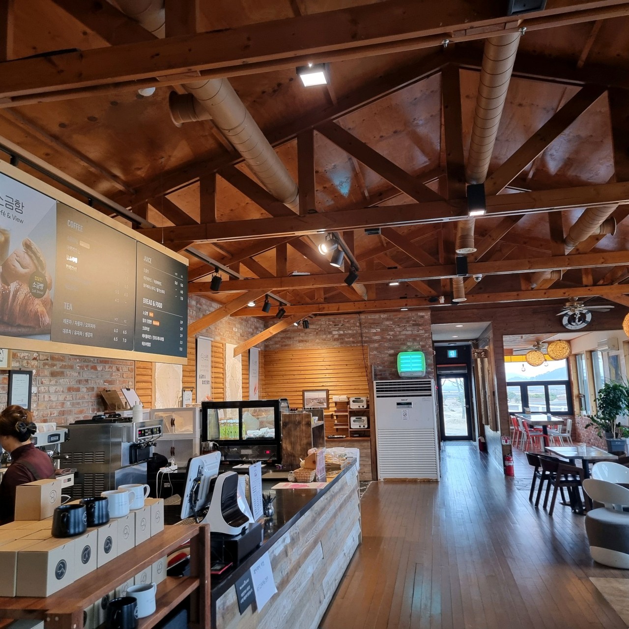 내부는 높은 천장과 넓은 창 덕분에 개방감이 좋아 답답함 없이 여유롭게 시간을 보내기 좋아요.