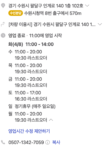 주소: 경기 수원시 팔달구 인계로 140 1층 102호