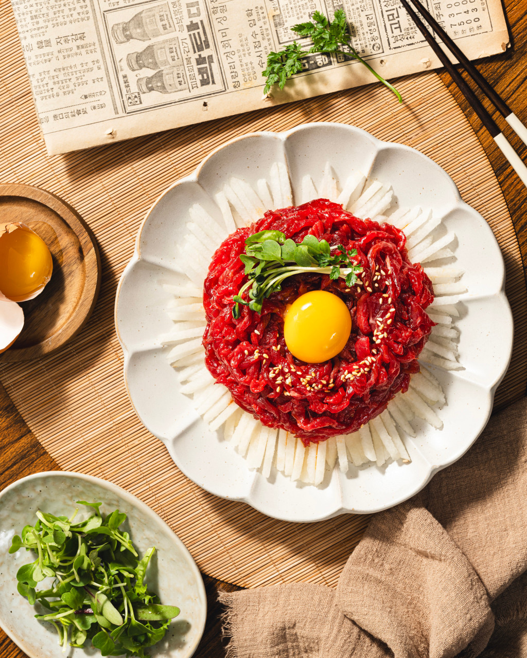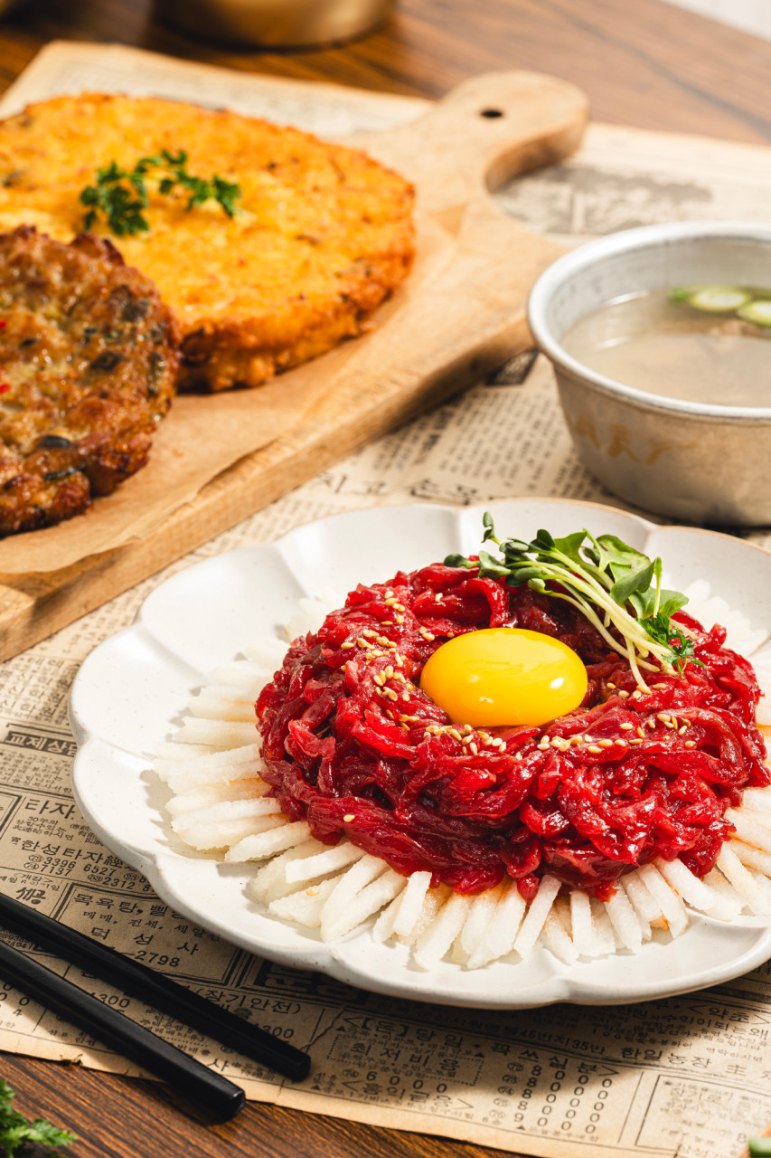 ‘신선한 육회와 고소한 빈대떡, 그리고 술안주로서의 조화’예요.