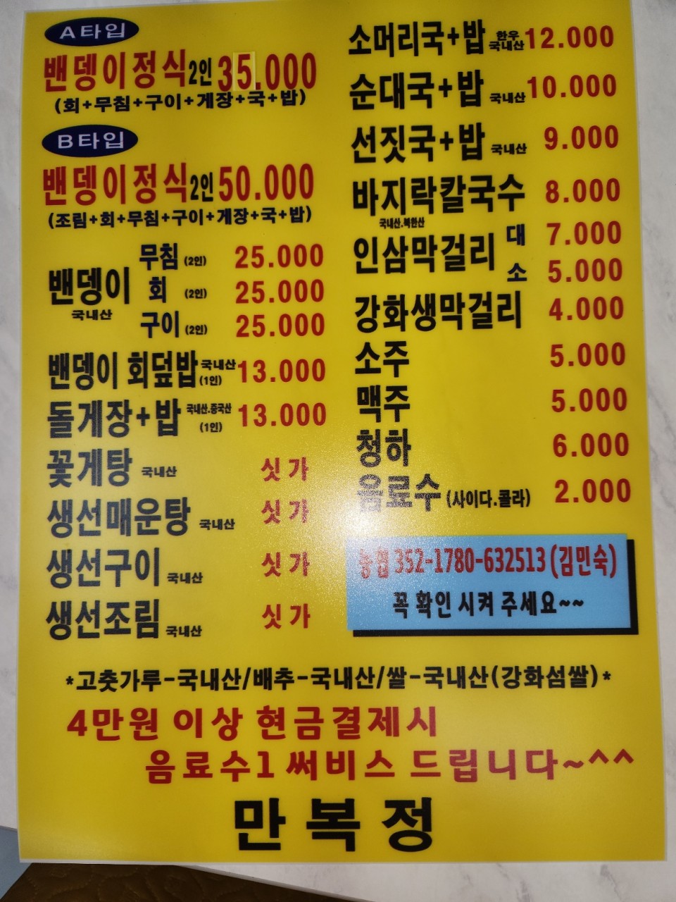 - 주소 : 인천 강화군 강화읍 중앙로 17-9 풍물시장 2층 32호 만복정