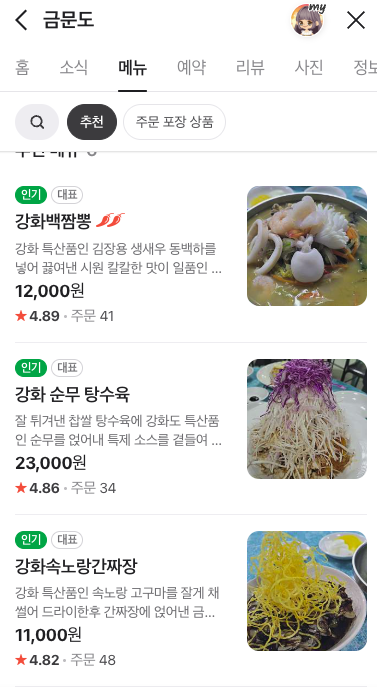 대표 메뉴는 아래와 같습니다.
