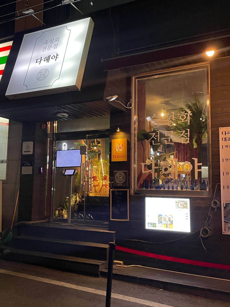 다해야의 외관은 은은한 조명과 세련된 간판이