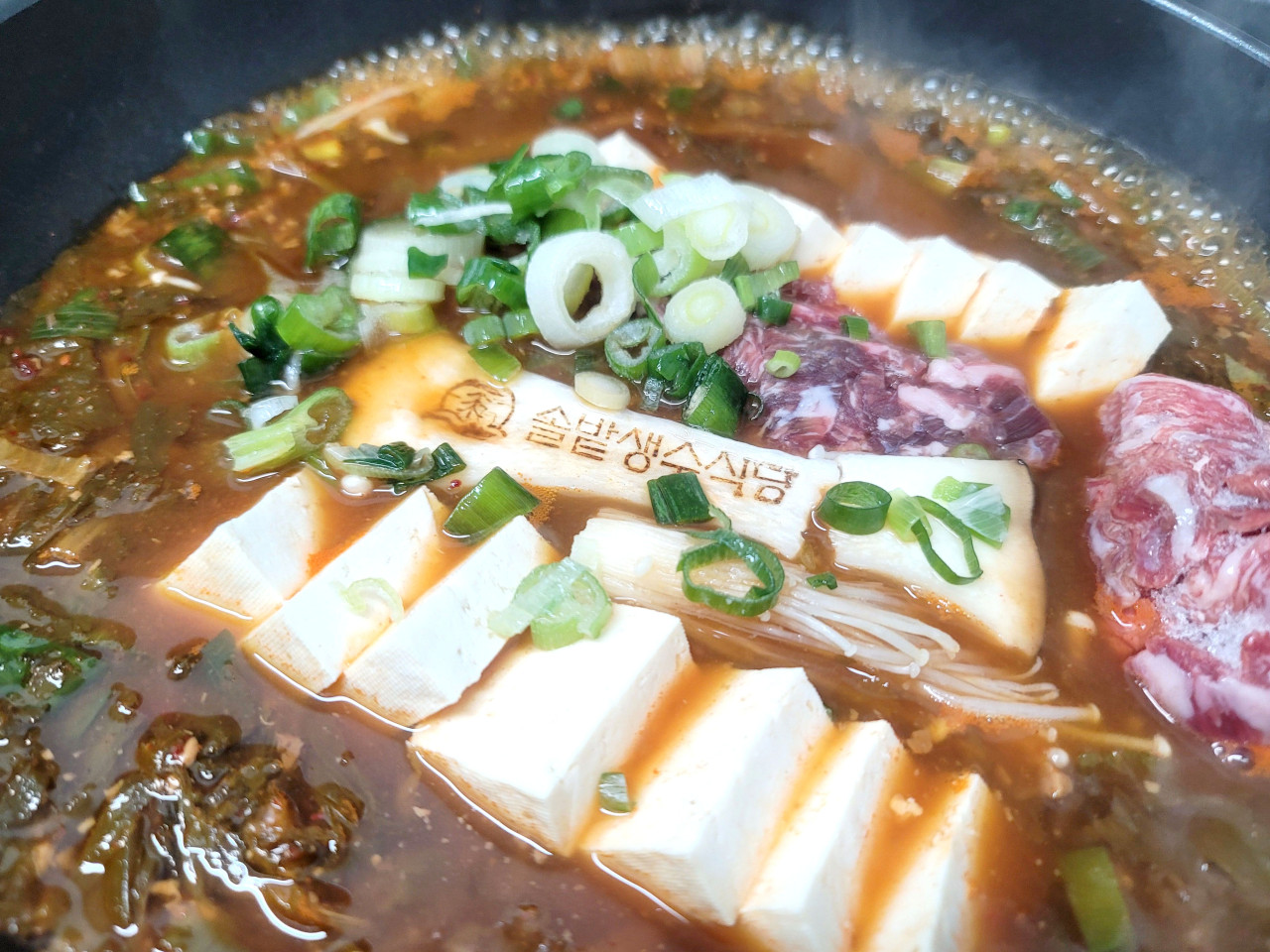 돌판에 한우 기름을 활용해 끓여낸 된장찌개가 진짜 하이라이트예요!