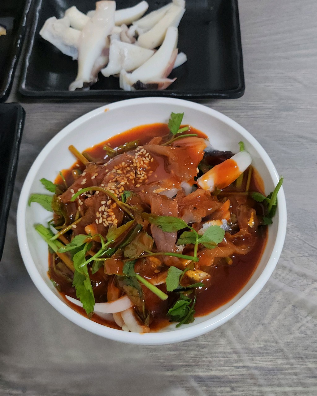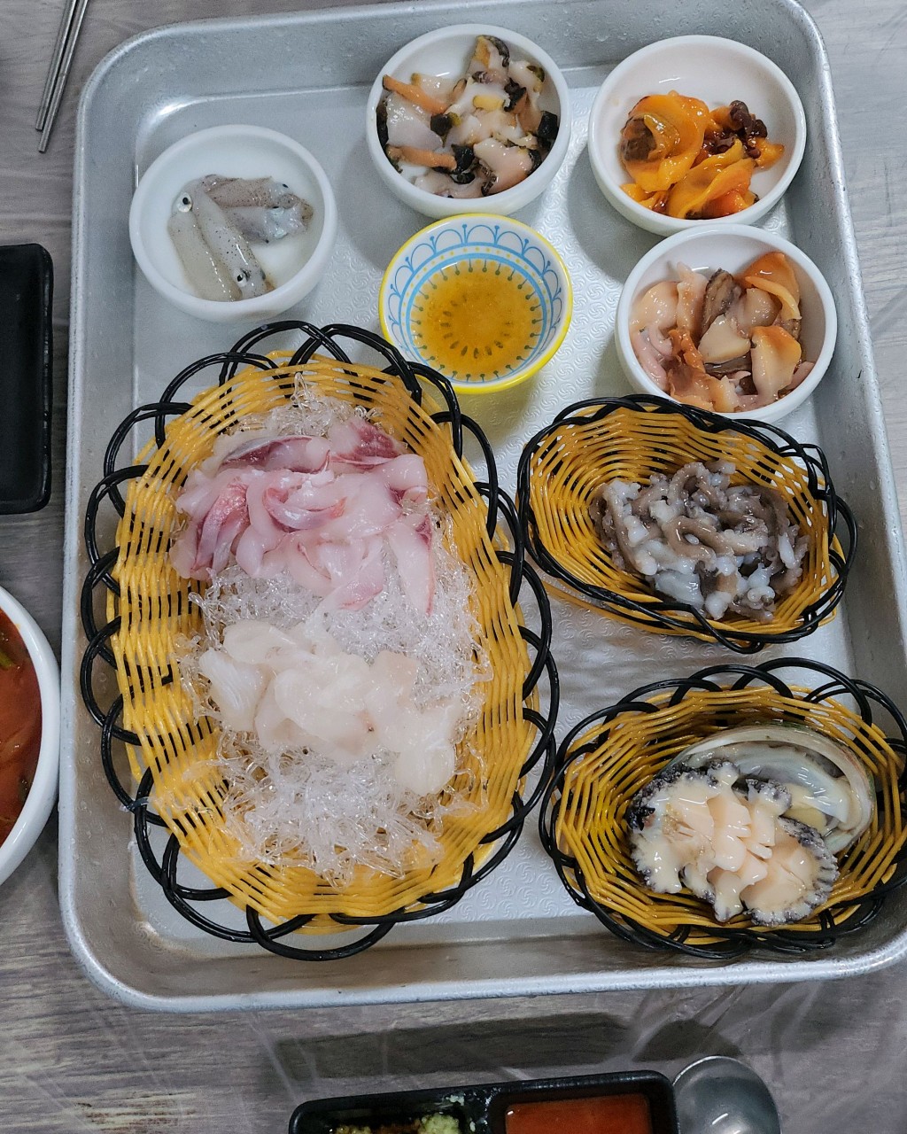 이곳은 ‘한상차림’ 형태로 메뉴가 구성돼 있어서 별도 주문 없이도 다양한 해산물을 즐길 수 있어요. 대표적으로 멸치회, 전복숙회, 해삼물회, 멍게비빔밥 등 통영 특유의 해산물들이 기본 구성으로 제공되고요, 식사는 1인 25,000원에 즐길 수 있어요. 단, 현금 결제만 가능하다는 점과 최소 2인 이상 주문이 가능한 점은 참고하셔야 해요.