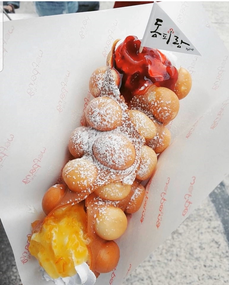 알록달록한 머랭 쿠키와 과일, 생크림이 올라간 홍콩식 와플인데요,