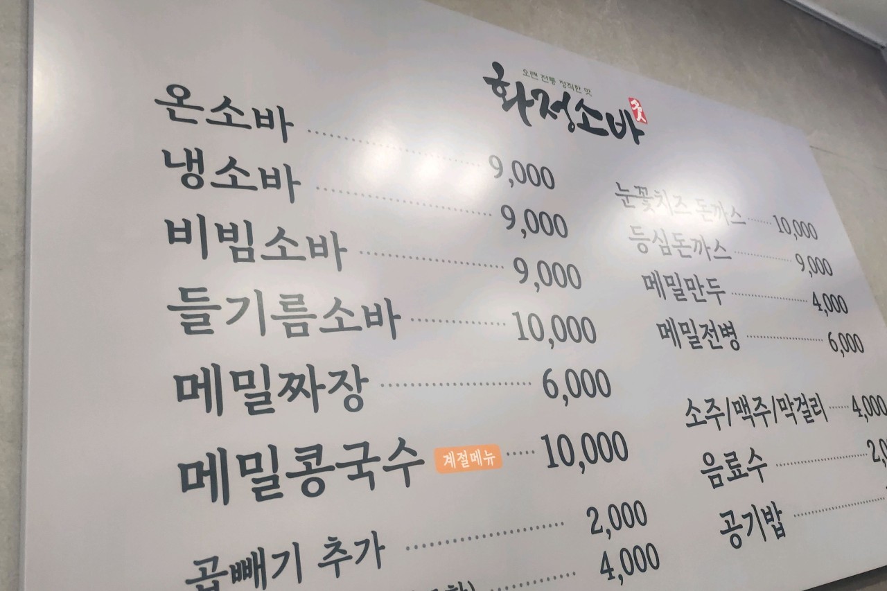 화정소바는 냉소바(9,000원), 들기름소바(10,000원), **메밀짜장(6,000원)**이 대표 메뉴예요.