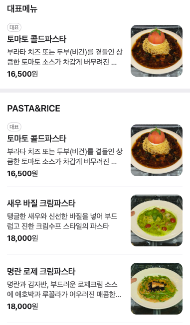 - 새우 바질 크림 파스타: 국물처럼 촉촉한 소스와 바질향이 어우러진 부드러운 맛