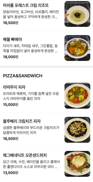 메뉴는 파스타, 피자, 샌드위치 등 식사류부터