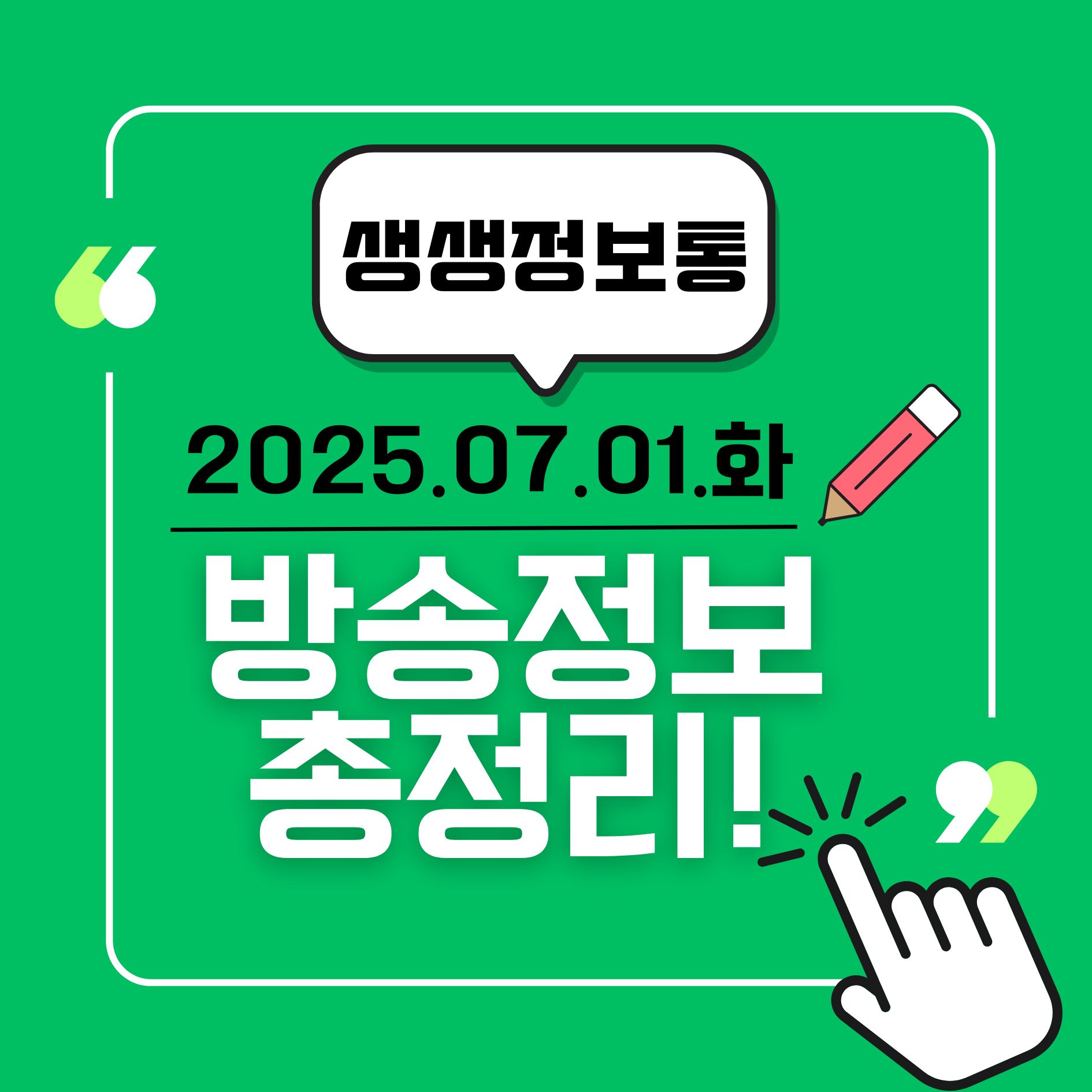 | [2TV 생생정보 2328회] 7월 4일 금요일 방송 정보 총정리 (1) | 2025.07.04 |