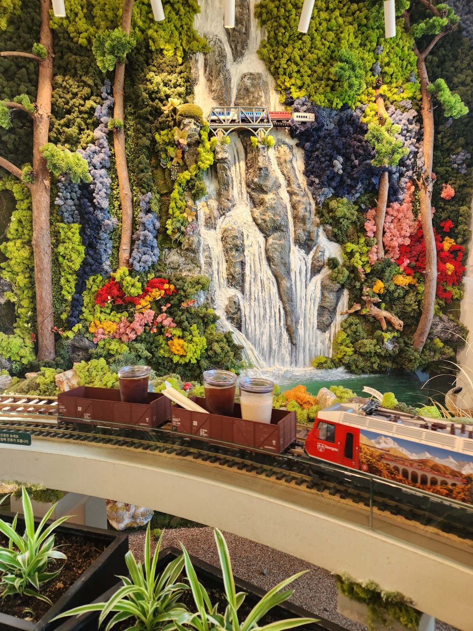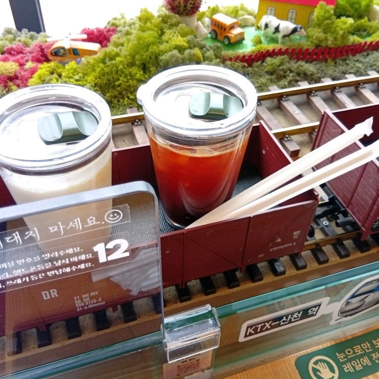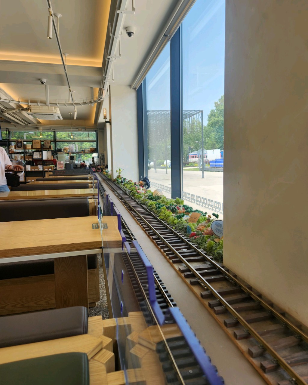 바로 ‘기차가 있는 풍경’이라는 곳으로, 이름처럼 실제 기차 모형이 테이블까지 음료를 배달해주는 재미있는 경험을 제공한다고 한다.