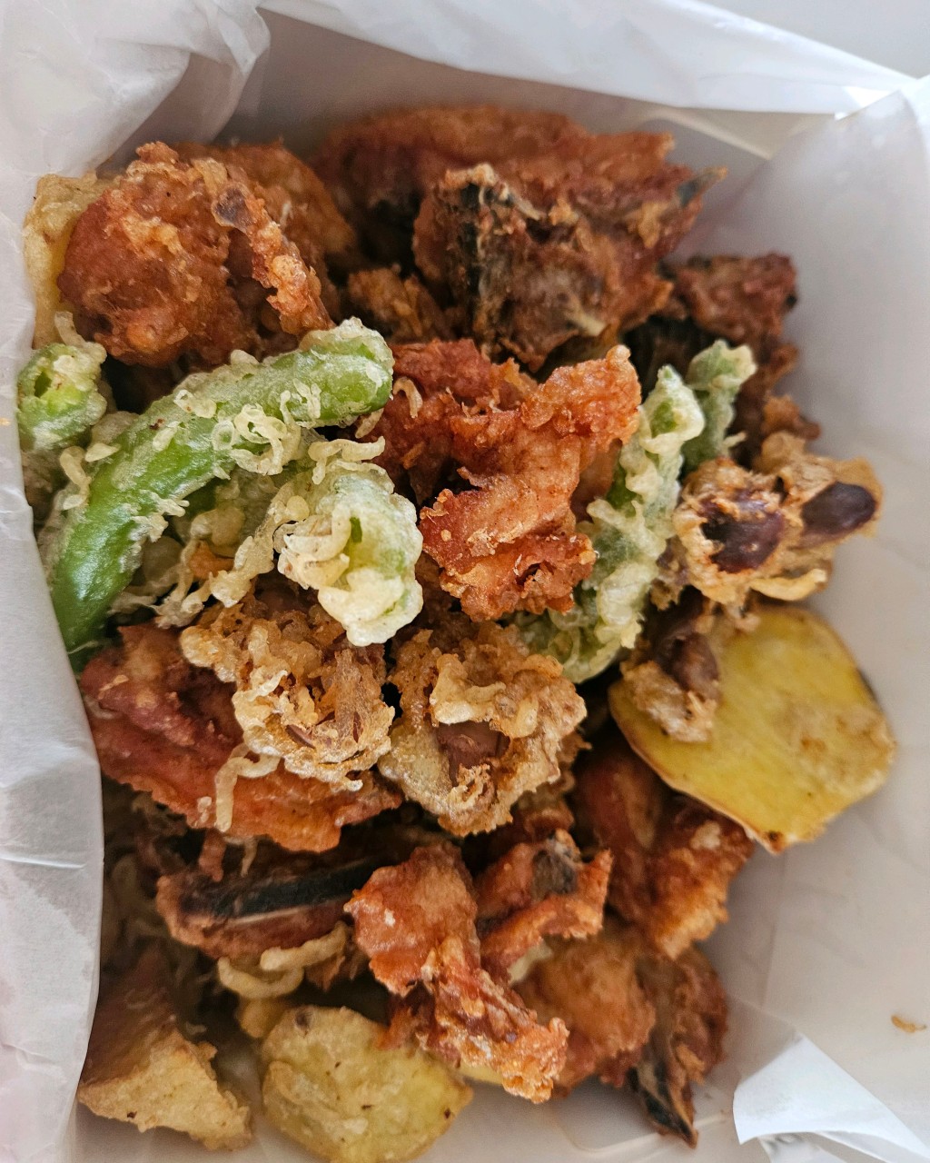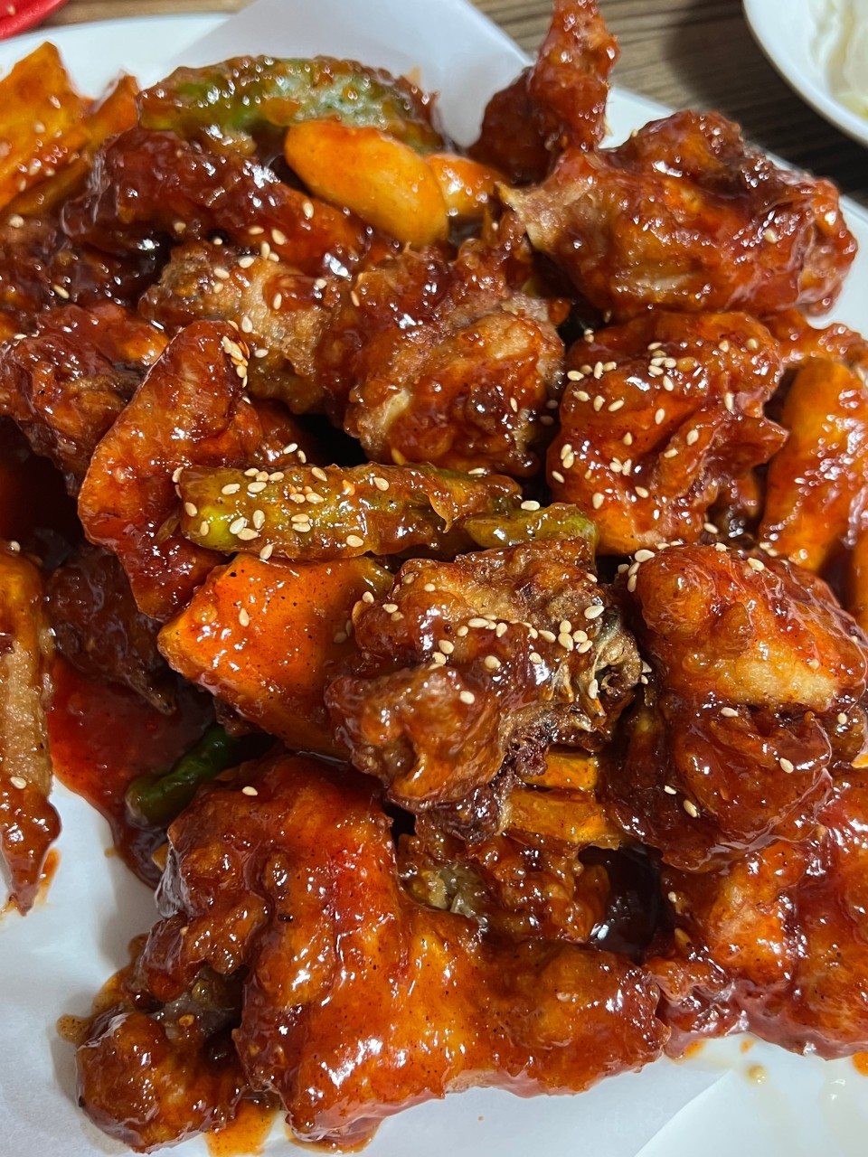 사이드 메뉴는 떡, 고구마튀김, 꽈리고추, 닭똥집 튀김 등 다양하게 구성되어 있으며
