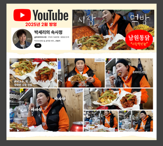 [2TV 생생정보 2350회] 8월 6일 수요일 취재 연락처. [할매~ 밥 됩니까?]<경자 할매의 옛날 통닭> 남원통닭동대문구 청량리 경동시장에는 50년 이상의 전통을 자랑하는 치킨 전문점 ‘남원통닭’이 자리하고 있다. 시장 치킨의 원조격으로 불리는 이곳은 오랜 세월 동안 변함없는 맛과 합리적인 가격으로 꾸준한 사랑을 받아왔다. 옛날 통닭 스타일을 기반으로 한 고소하고 바삭한 치킨 맛과 다양한 사이드 메뉴 구성이 특징이며, 청량리 지역에서 통닭 하면 가장 먼저 거론되는 대표 맛집 중 하나다.