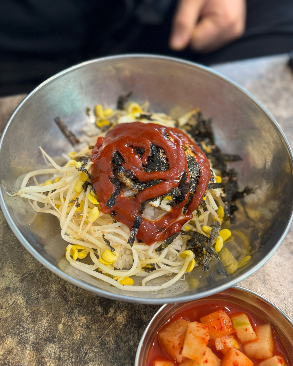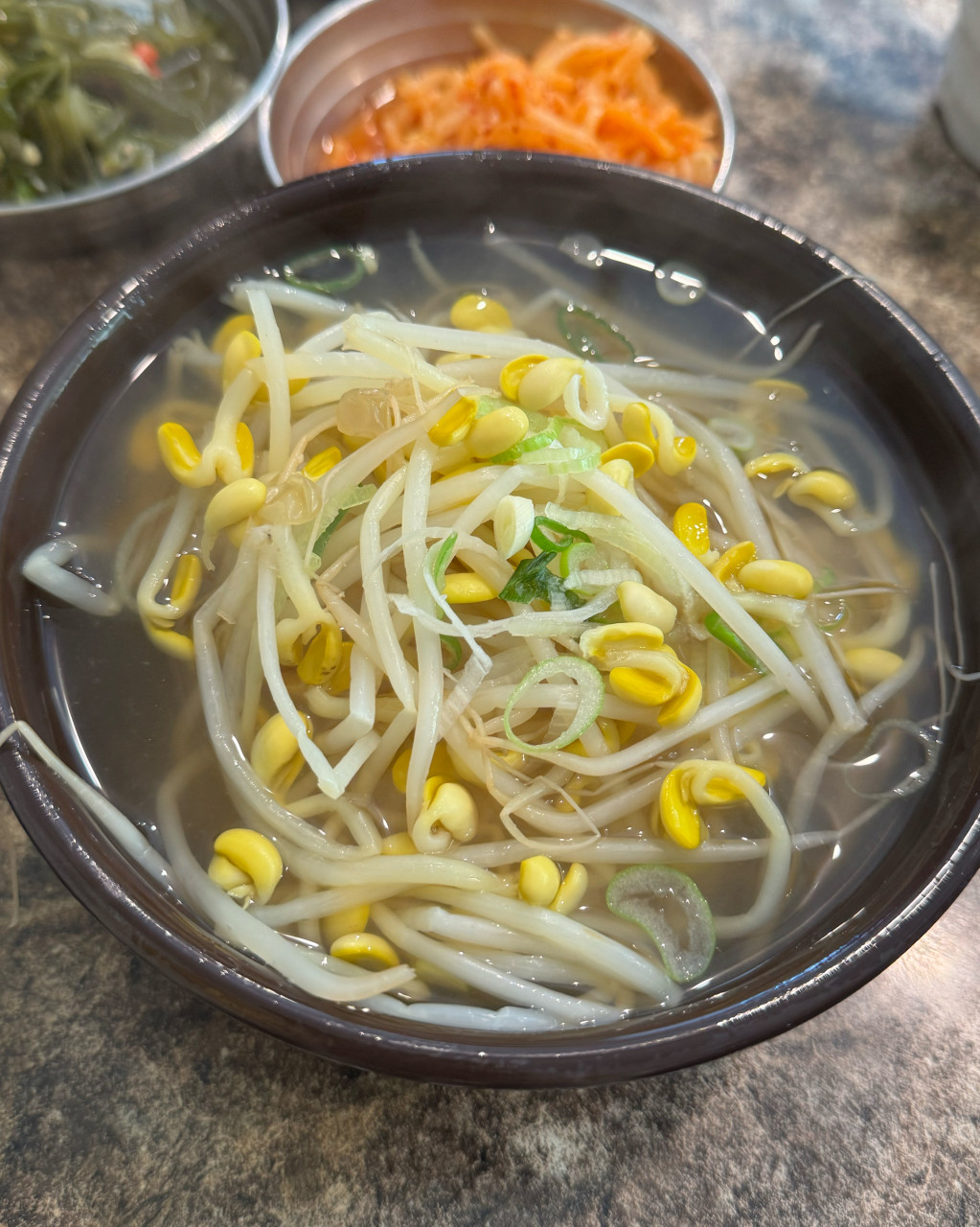 대표 메뉴인 콩나물국밥은 3,000원에 제공되며, 뚝배기에 담겨 김이 모락모락 나는 국물과 아삭한 콩나물이 조화를 이룬다. 국물 맛은 담백하고 깔끔하며 자극적이지 않다. 함께 제공되는 김치와 깍두기는 아삭하고 간이 적당하다.