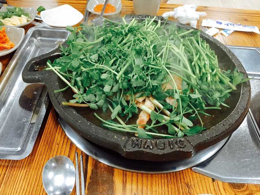 사랑채에서 가장 인기 있는 메뉴는 단연 미나리 삼겹살입니다. 방송에서도 강조되었듯, 이곳의 미나리는 현지 농장에서 직접 재배한 신선한 미나리를 사용한다고 해요.